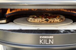 Unsere Tomatenpizza ist jetzt bereit für den Pizzaofen, der bereits vorgeheizt sein sollte. Die Pizza wird vorsichtig, aber mit Schwung den Pizzaschieber gezogen, welcher vorab mit ein wenig Semola bestreut wird. Zubereitet haben wir die Pizza mit Tomaten im Everdure KILN Pizzaofen mit zwei Brennern. Der Pizzaofen wird mit beiden Brennern für ca. 15 Minuten auf Maximalleistung aufgeheizt, so dass eine Backtemperatur um die 450-500°C im Ofen entsteht. Wer ein Infrarot-Thermometer hat, kann die Temperatur auf dem Pizzastein auch messen. Dieser sollte etwa 380-400°C haben. Der rotierende Pizzastein wird dabei mit eingeschaltet, damit die Pizza von allen Seiten gleichmäßig gebacken wird. Die Tomatenpizza wird mit dem Pizzaschieber in den heißen Ofen befördert und in rund 60-70 Sekunden fertig gebacken.