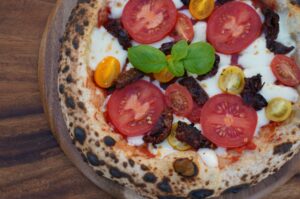 Unsere Tomatenpizza mit frischen und halbgetrockneten Tomaten ist eine fruchtig-frische Pizza, die in Kombination mit frischem Basilikum und Fior di Latte Mozzarella einfach richtig gut schmeckt.