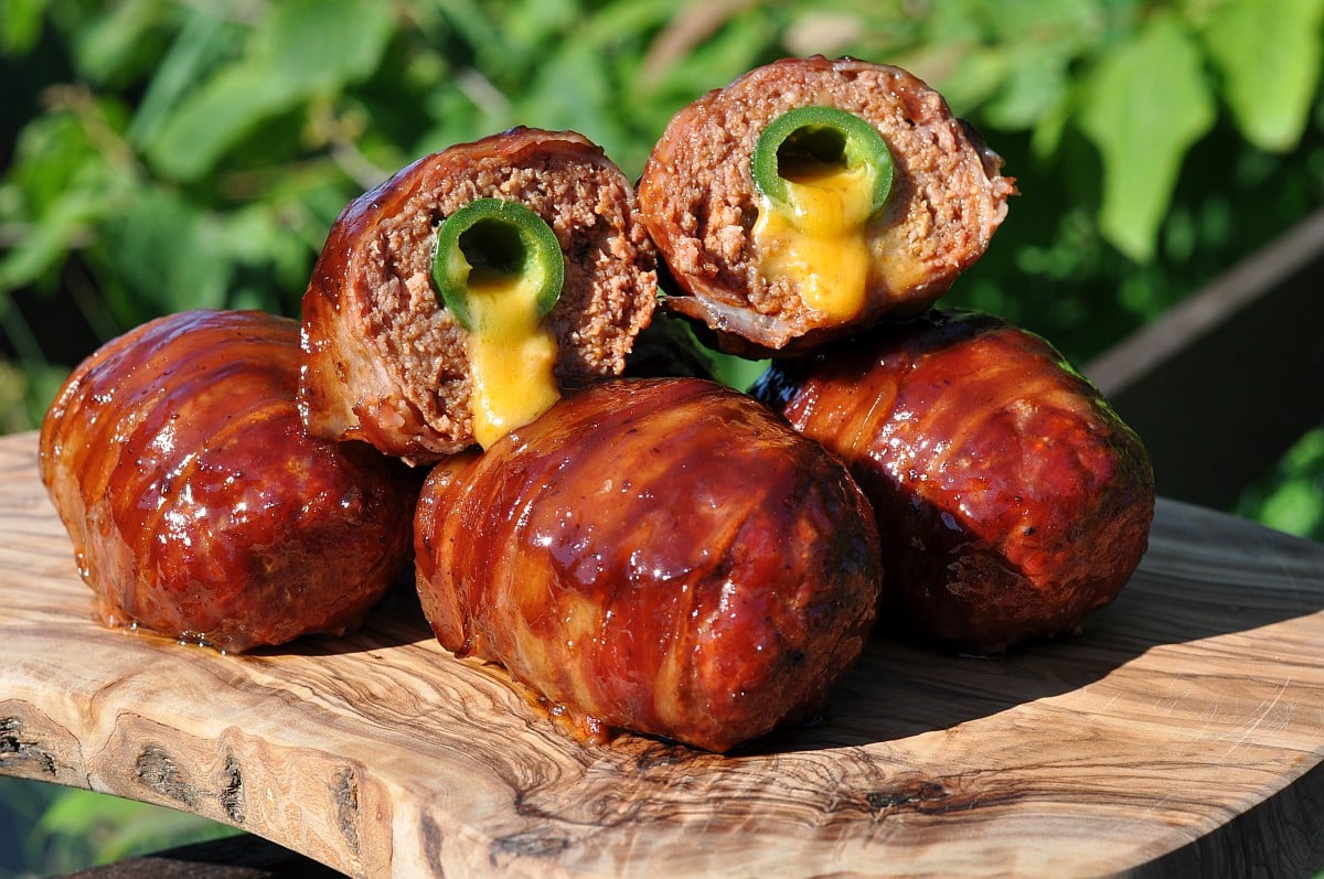 Armadillo Eggs sind ein echter BBQ-Klassiker, die ihren Ursprung in Texas haben. Die würzigen Hackfleischbällchen im Speckmantel werden auf dem Grill mit Barbecue Sauce glasiert. Im Inneren beherbergt sich eine mit Käse gefüllte Chili (meist Jalapeno) und beim Anschnitt läuft der flüssige Käse aus dem Hackfleisch-Ei heraus.
