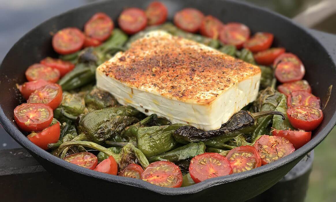 Zunächst werden die Bratpaprika in einer Gusspfanne (hier: Petromax Feuerpfanne fp25h) bei mittlerer Hitze für ca. 5 Minuten in Olivenöl angebraten und dann mit Salzflocken bestreut. Die Kirschtomaten werden halbiert und an den Rand der Gusspfanne auf die Pimientos gelegt, sobald die Bratpaprika etwas Farbe bekommen haben und anfangen Blasen zu werfen. Der Feta-Käse wird aus der Packung entnommen – ggf. mit einem Küchenpapier ein wenig abgetrocknet – und dann mittig in die Pfanne gelegt. Auf den Feta streut man dann großzügig noch etwas vom Smoking Zeus BBQ-Rub.