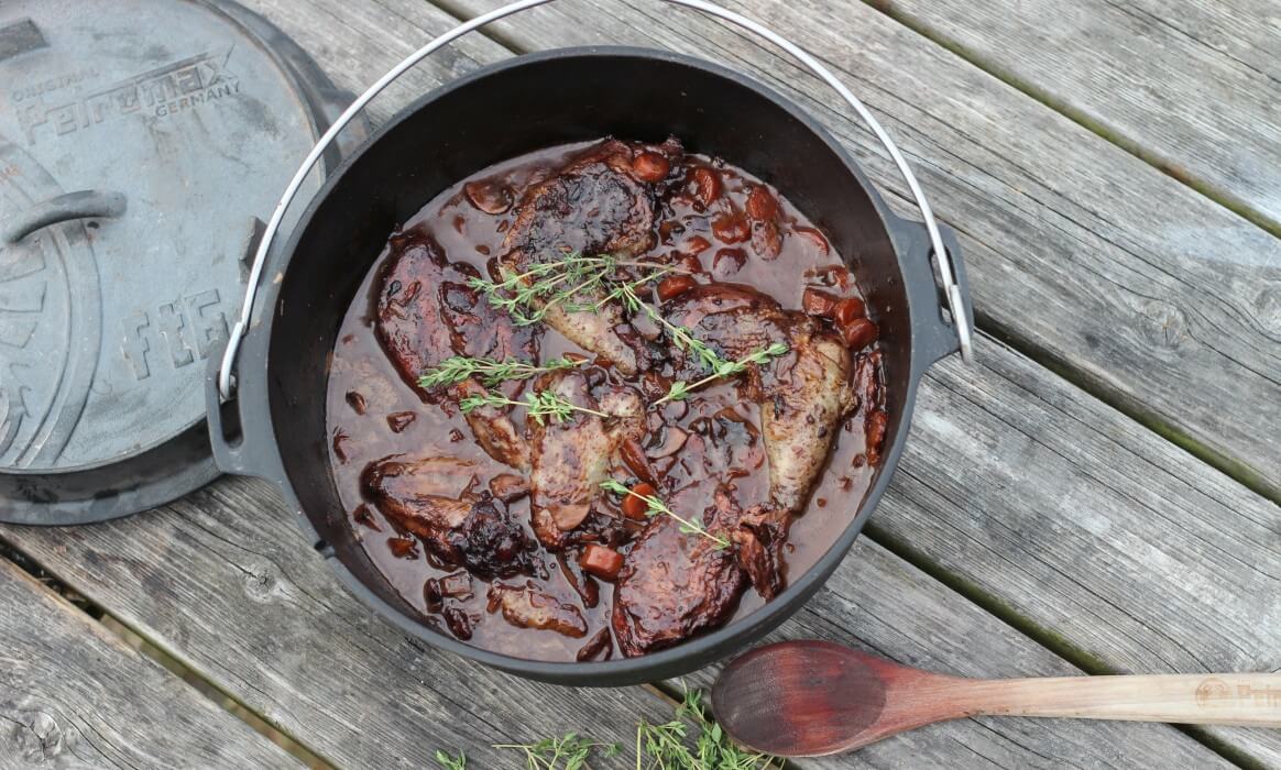 Coq au Vin ist ein französisches Nationalgericht und bedeutet übersetzt „Hahn im Wein“. Wir zeigen euch, wie man den Klassiker aus Frankreich im gusseisernen Dutch Oven zubereitet.