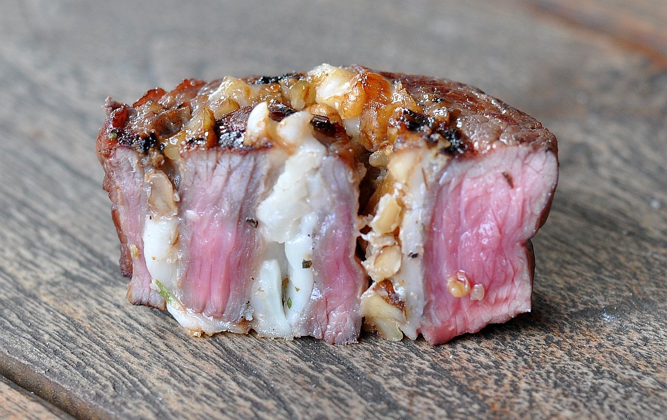 Ich hab es sowohl einmal am Stück wie auch bereits geschnitten gegrillt. Ich bevorzuge ganz klat die Rolle komplett zu Grillen. Erst scharf anbraten und dann indirekt auf 56Grad garziehen lassen. Vorteil an der Variante ist die bessere Temperaturkontrolle und ,der viel wichtigere, der Käse läuft nicht raus 😉