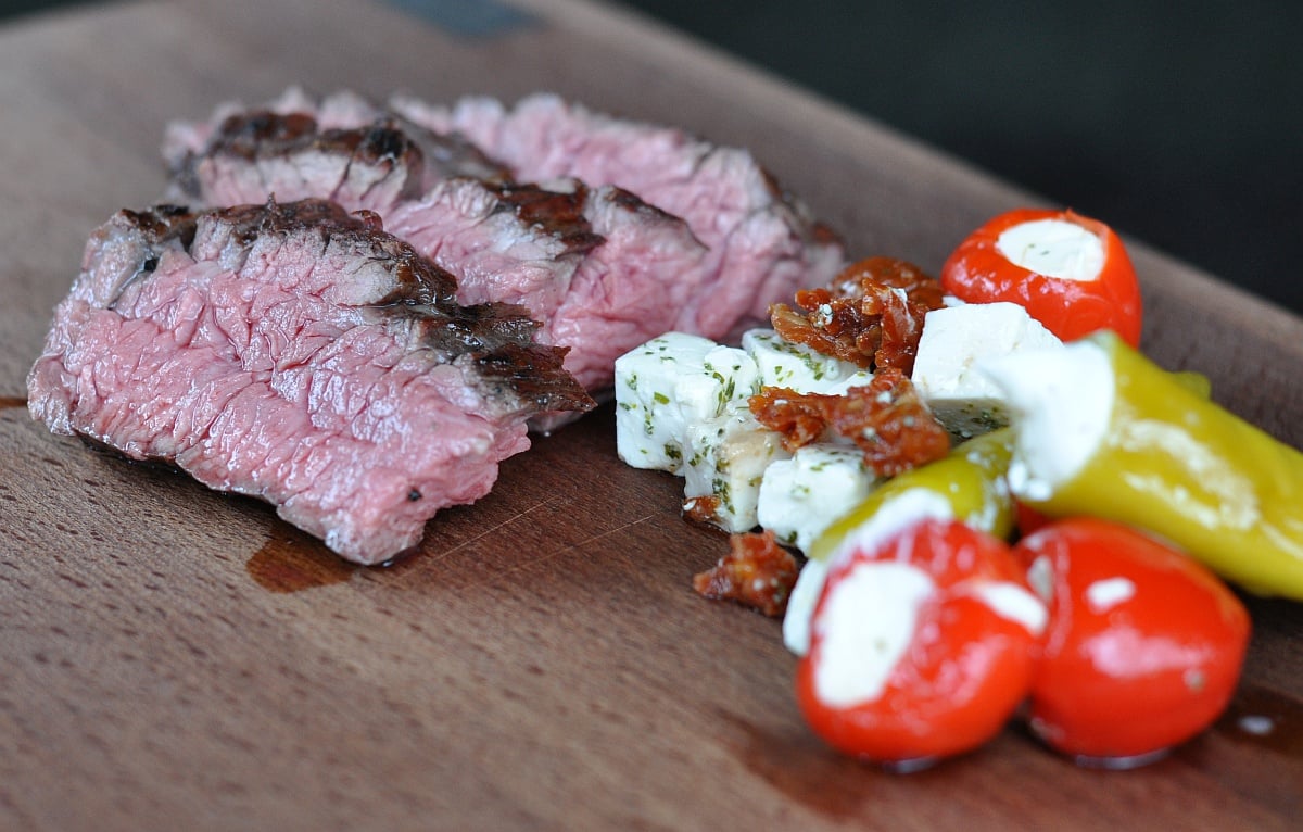 Nach etwa 30 Minuten war das Steak auf der gewünschten Temperatur und ich hab das Flap vom Grill genommen und mit Antipasti serviert. Beim Anschneiden sollte man darauf achten, dass man das Steak quer zur Faser aufschneidet.