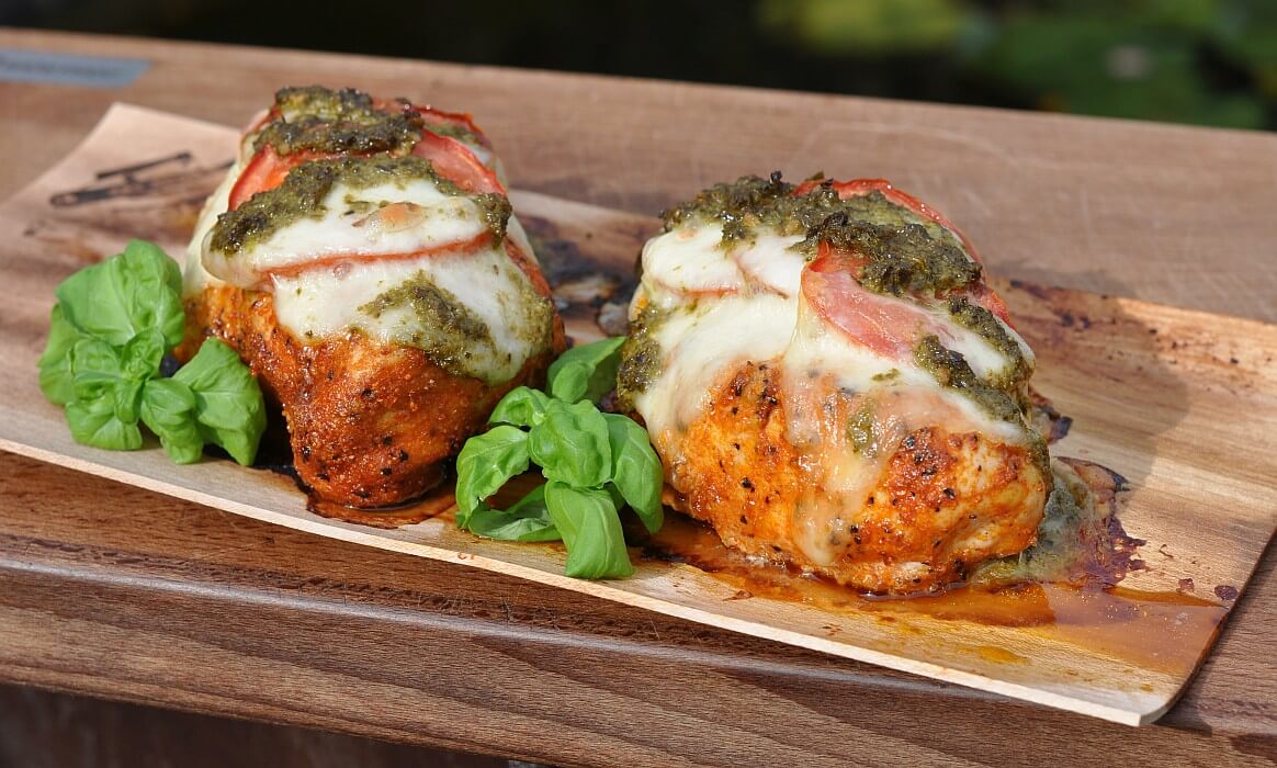Hähnchenbrust Caprese ist saftiges Hühnerbrustfilet, welches schonend auf der Planke gegart wird und gleichzeitig mit Tomate, Mozzarella und Pesto überbacken wird.
