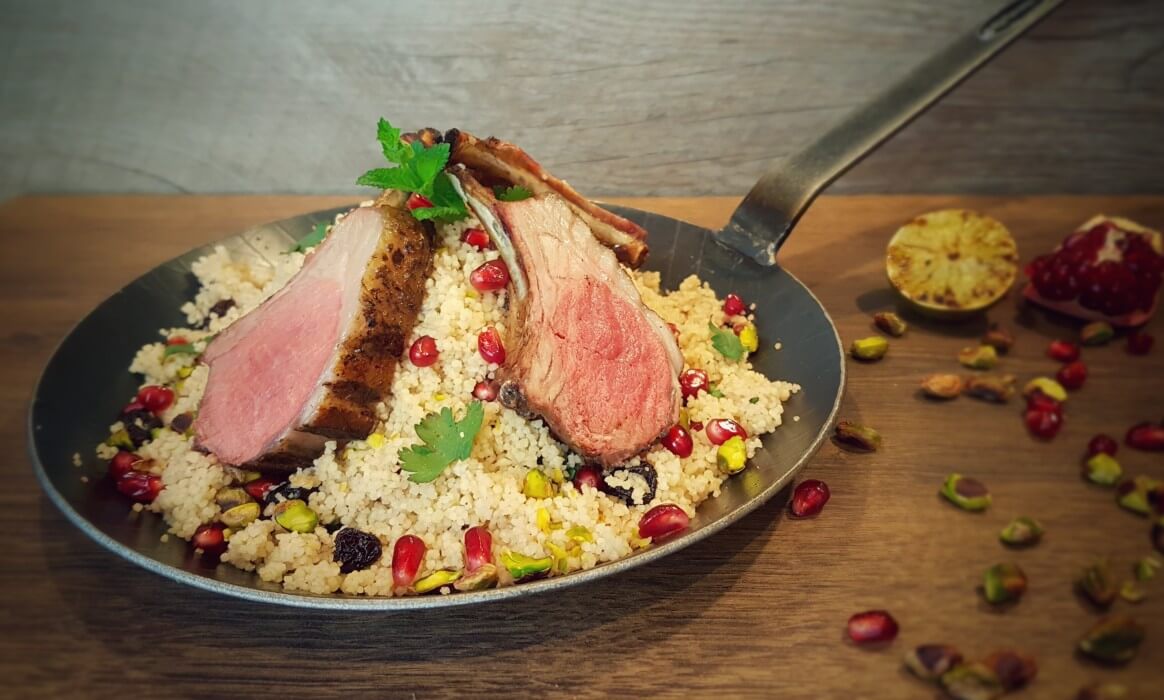 Mit diesem schmackhaften Gericht machen wir einen Abstecher in die arabische, bzw. nordafrikanische Küche, denn Teil unseres Lamm-Gerichts ist der Couscous. Dieser besteht eigentlich aus zu Kügelchen zerriebenen Hartweizengrieß, Gerste oder Hirse. Dieser wird nicht gekocht, sondern lediglich gedämpft oder mit heißem Wasser übergossen, wodurch die Zubereitung recht schnell ist. Der Hauptdarsteller ist aber natürlich die Lammkrone. Wir haben hier Nordsee-Lammkarree aus dem Hause Otto Gourmet verwendet.