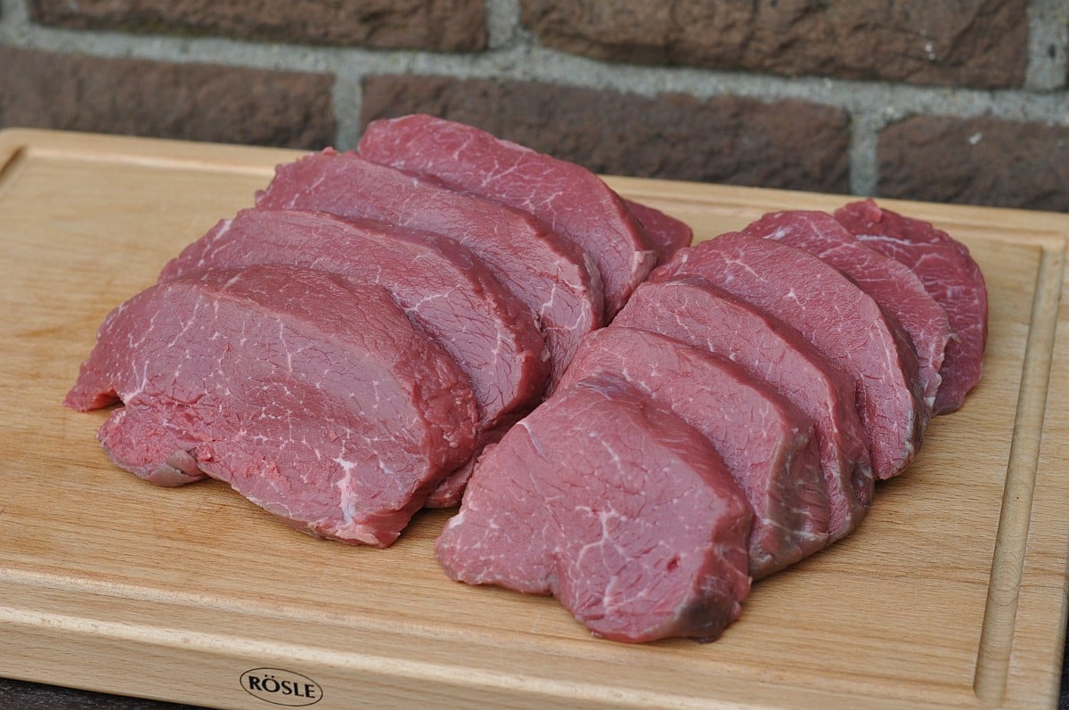 Hallo Bernd, das Filet ist ja bereits ausgelöst. Hier muss man ggf. noch die aussenliegende Silberhaut entfernen, aber ansonsten kann man es ganz normal quer zur Faser in Steaks schneiden.