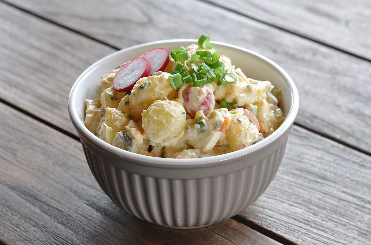 Sandras Kartoffelsalat wird zwar mit Mayonnaise gemacht, hat jedoch nichts mit dem pampigen Salat zu tun, den man gewöhnlich kennt. Dank der Frühlingszwiebeln und Radieschen bekommt er einen frischen Geschmack. Dieser Salat darf bei uns bei keiner Grillparty fehlen!