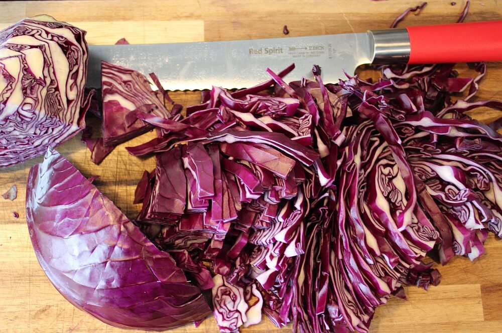 Wichtig: Ihr solltet bei der Zubereitung des Rotkohls (vor allem, beim Schneiden und Hobeln) unbedingt Einmalhandschuhe tragen, denn der Rotkohl färbt ab und die Farbe bleibt hartnäckig. Es dauert mehrere Tage, bis man die rot-blaue Farbe wieder von den Fingern bekommt!