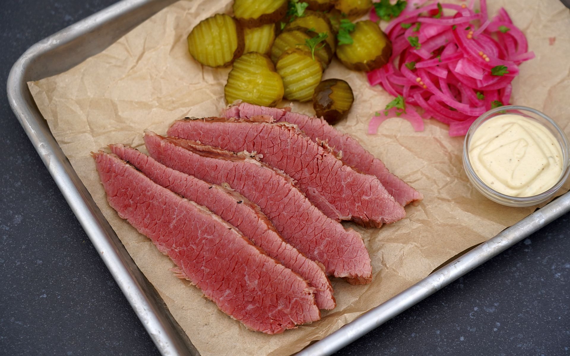 Nach dem Kochen erhält man wunderbar zartes Fleisch mit würzig-salzigem Charakter. Es wird häufig warm und kalt auf Sandwiches und Bagels mit Essiggurken und Senf serviert.