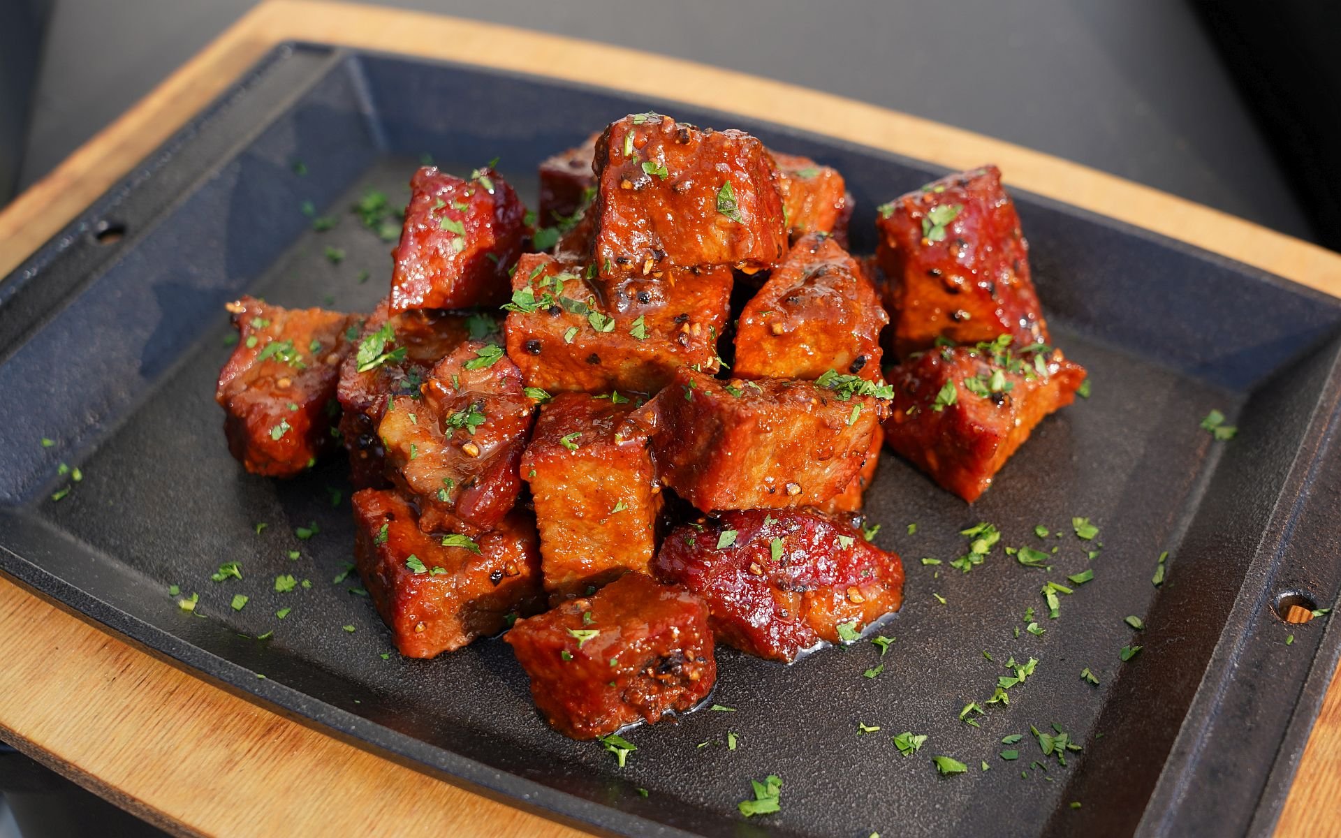 - Wenn es vom Grill genommen wurde, wird es in etwa gleich große Würfel (ca. 3 x 3 cm) geschnitten. Die Fleischwürfel werden mit der BBQ-Sauce und Butter in eine Edelstahlschale gegeben. Alles wird gut vermischt und mit Alufolie luftdicht verschlossen. Es ist wichtig, dass die Schale richtig dicht verschlossen wird, damit die Tri Tip Burnt Ends auch richtig zart werden. Wenn die Burnt Ends luftdicht verschlossen sind, kommen sie für weitere zwei Stunden zurück auf den Grill. Die Temperatur bleibt bei 125°C. Nach zwei Stunden sollten die Tri Tip Burnt Ends fertig sein. Wenn man eine Gabel ohne Widerstand in das Fleisch stecken kann, sind sie fertig und können serviert werden. Ist das noch nicht der Fall, wird die Garzeit entsprechend verlängert.