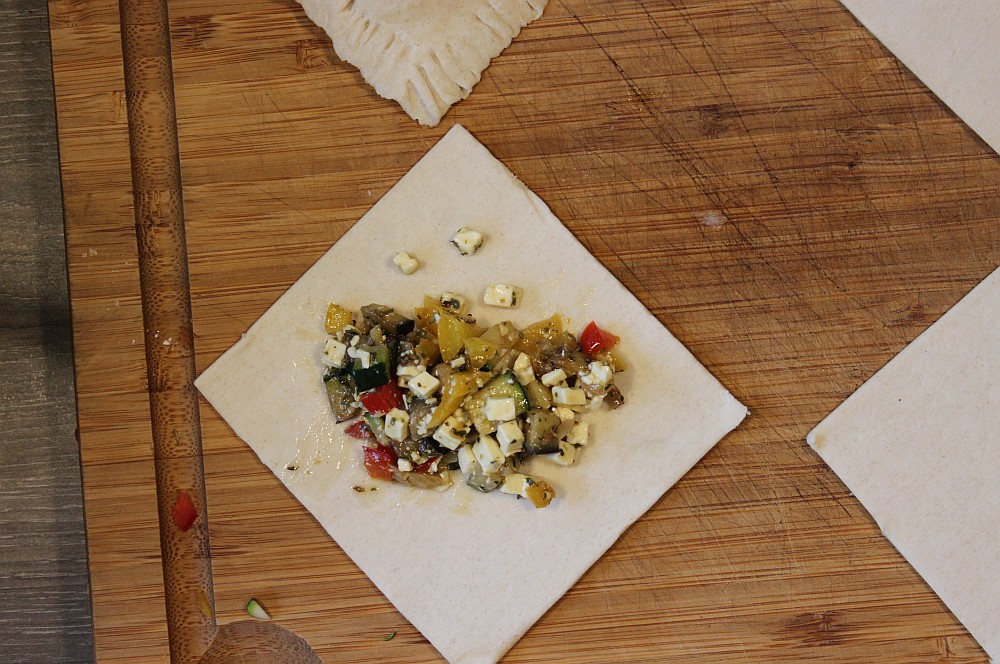 Spätestens jetzt sollten die Blätterteigscheiben aufgetaut sein. Die Blätterteigquadrate werden nun mittig jeweils mit 3 Esslöffeln der Feta-Gemüsemischung belegt. Die Quadrate werden nun diagonal zu einem Dreieck gefaltet und die Ränder werden mit Hilfe einer Gabel zusammengedrückt und verschlossen.