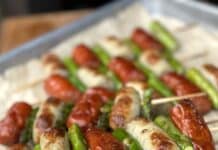Wir nutzen die Spargelzeit und kombinieren grünen Spargel mit Bratwurst und servieren euch Bratwurstspieße mit grünem Spargel und einer selbstgemachten Honig-Senf-Sauce.