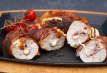 Saftige gefüllte Hähnchenbrust aus der Heißluftfritteuse mit Bacon, Schinken und Käse – knusprig, würzig und perfekt gegart für maximalen Genuss.